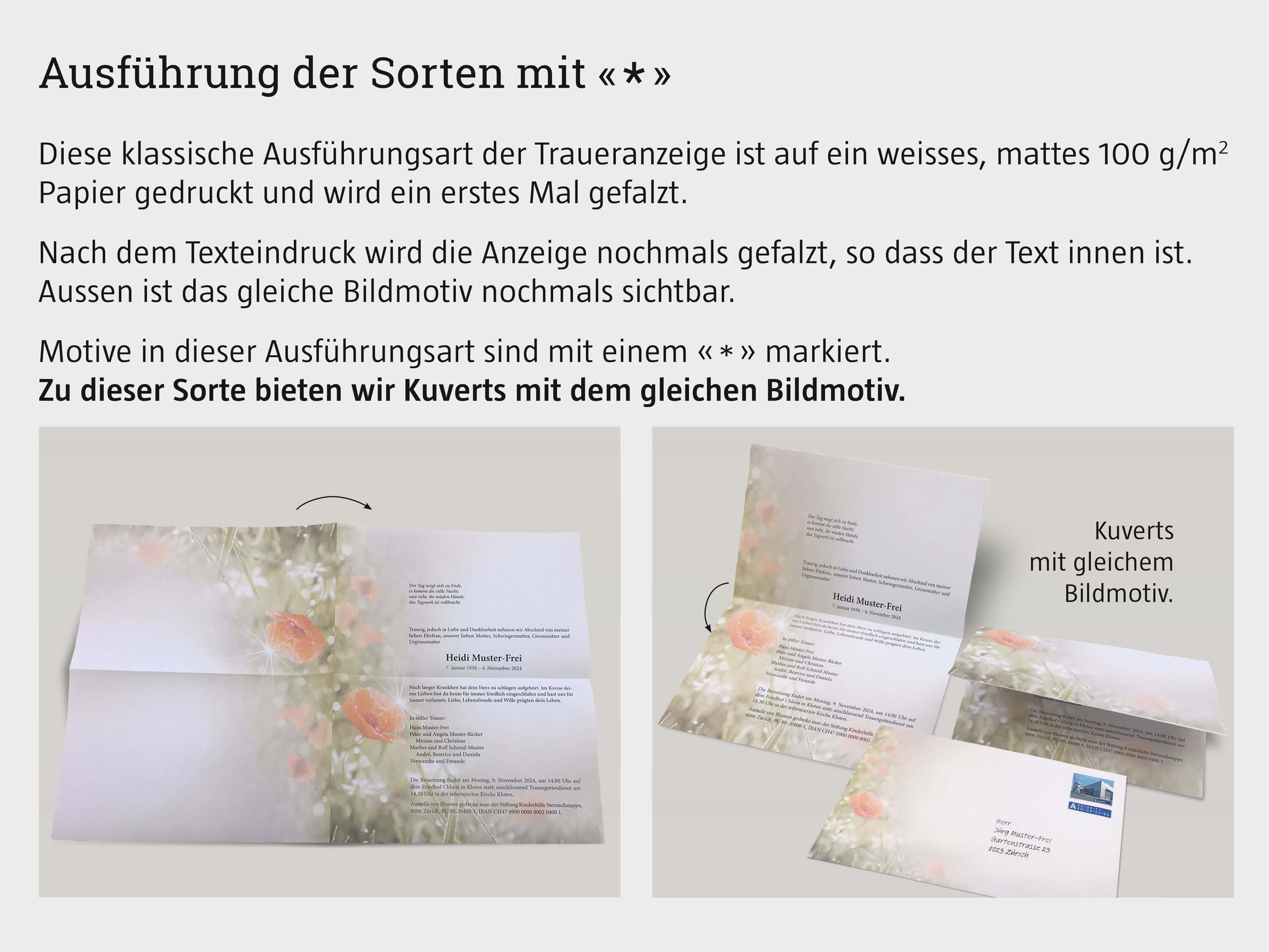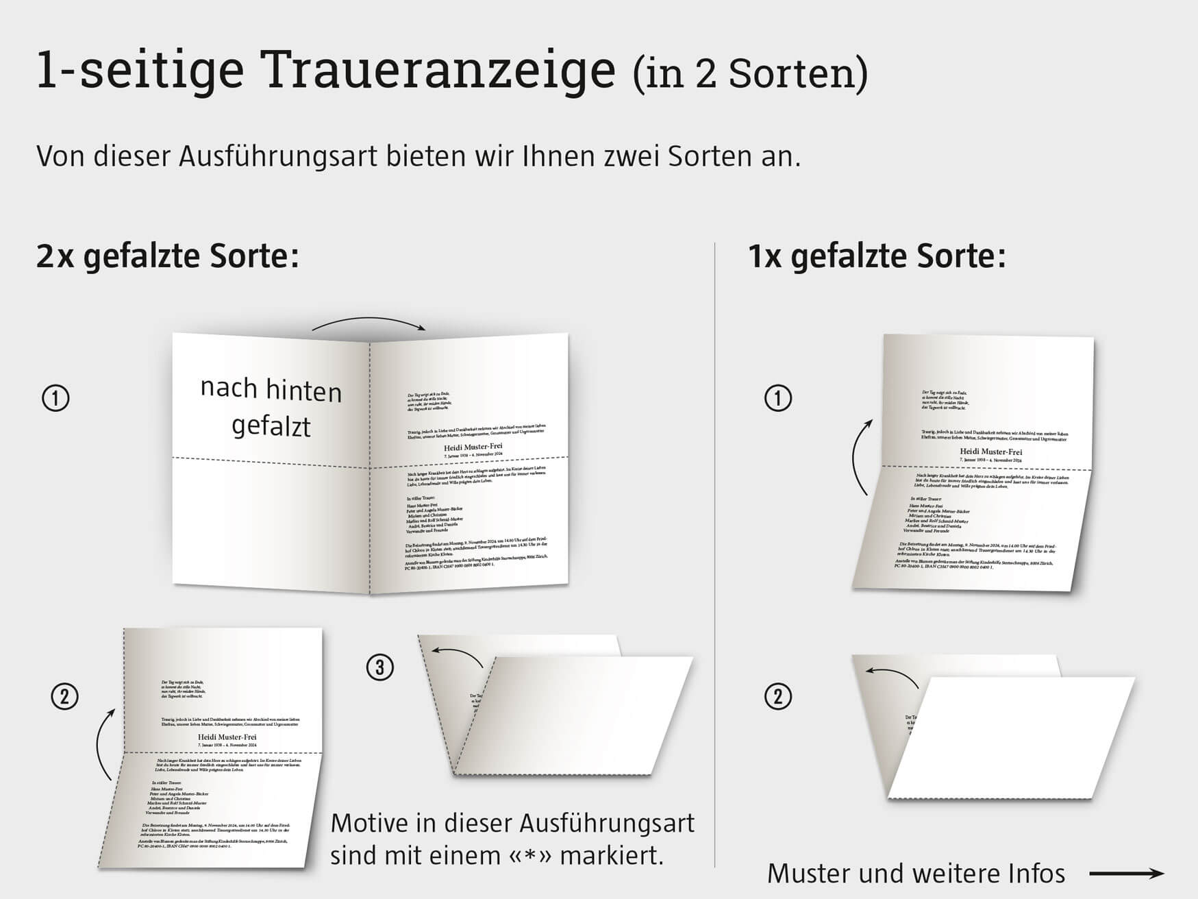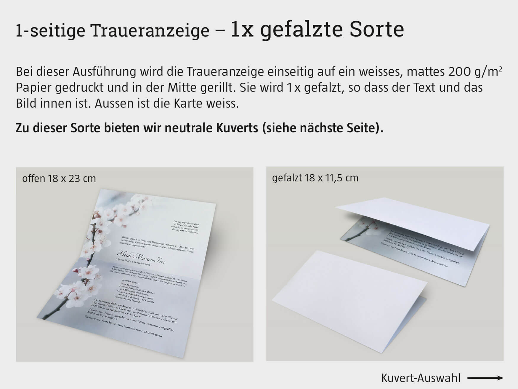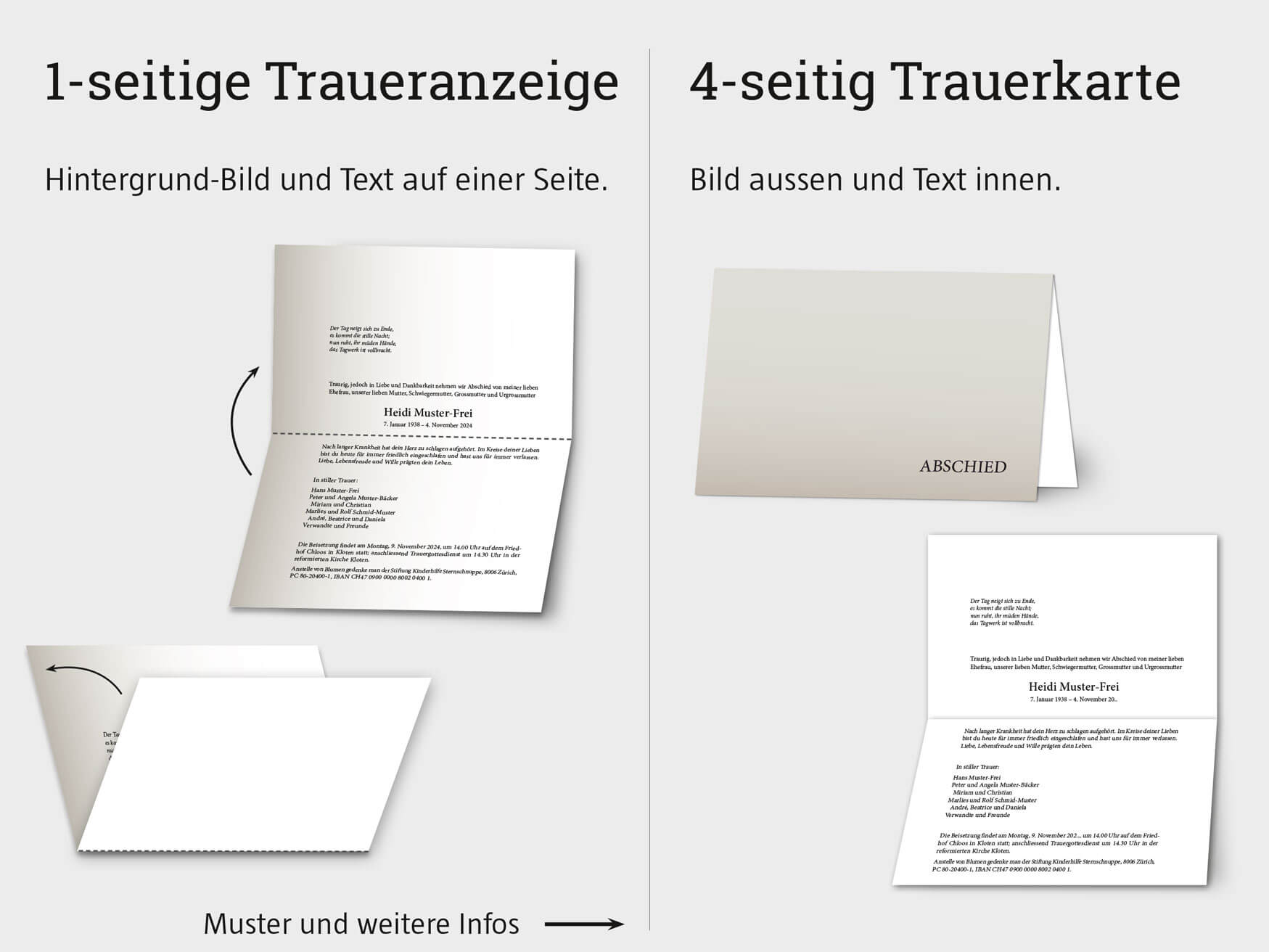 Wählen und bestellen Sie aus einer grossen Auswahl eine Traueranzeige oder Trauerkarte mit passenden Kuverts – gerne gestalten, drucken und versenden wir nach Ihren Wünschen. Wärend dem Bestellprozess werden Sie durch alle Teile geführt und erhalten auch Textbeispiele, die bei der Formulierung der schmerzlichen Nachricht mit Einladung zur Beisetzung und Abdankung helfen.