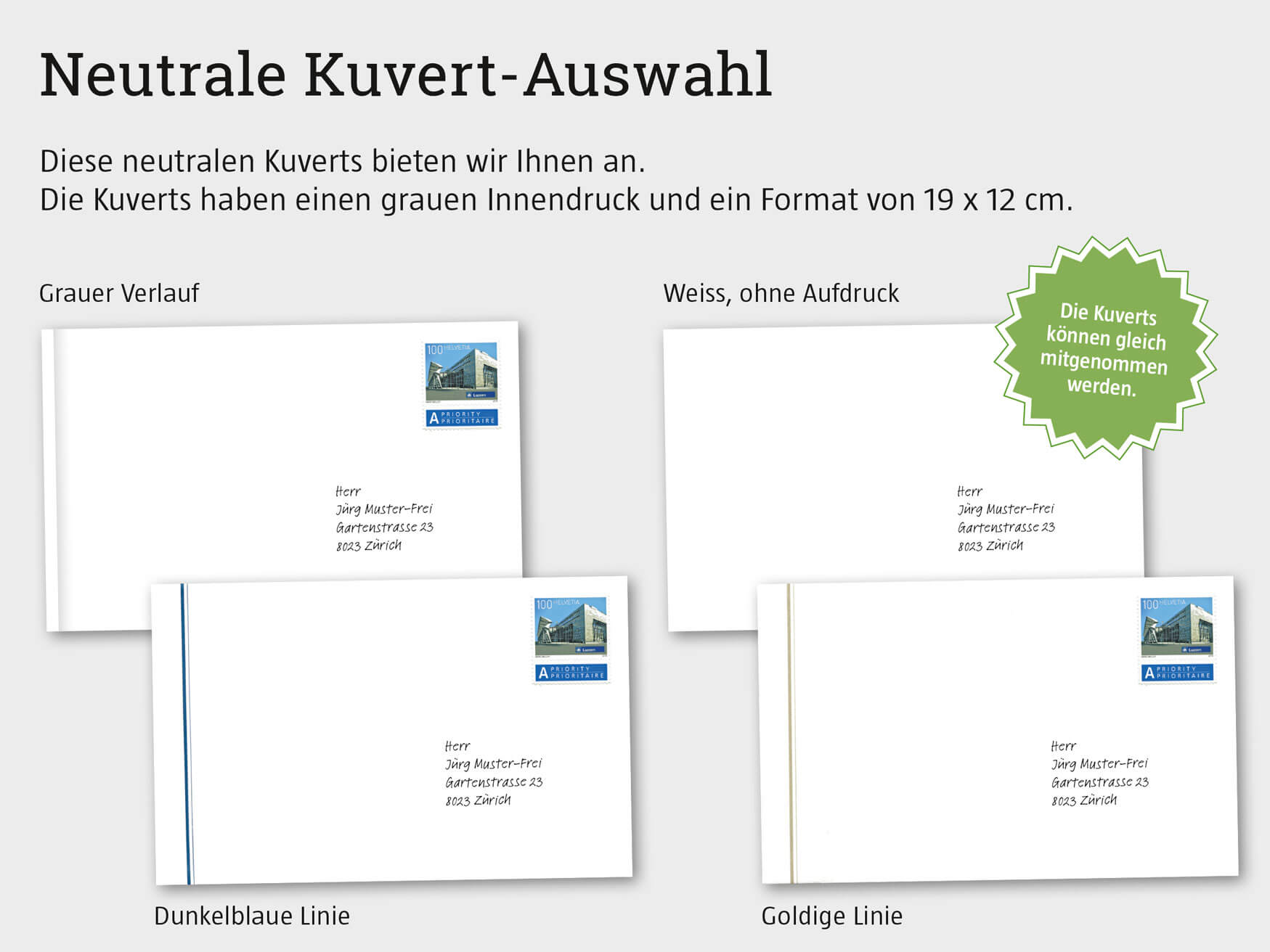 Wenn Sie auf das Sujet klicken, erhalten Sie mehr Infos zur Ausführung, zur Kuvertauswahl und können auch die Kosten berechnen. Sagt Ihnen das Sujet zu, können Sie dann im unteren Teil die Bestellung eingeben. Unter Punkt 4 «Menge / Preise / Zusatzleistungen» sind dann die Kosten nochmals ersichtlich. ⇒ Bestellablauf